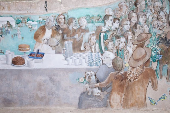 ... Most of this summer of 1956 was spent painting the mural with Gordon Davies, I painting the figures, he the flowers and birds and rocks. He was a perfect painting companion, quick and skilful and inventive, and, swinging about the scaffolding like a monkey, could make all the adjustments needed for painting at different heights. We campedin the sexton's hut, Gordon sleeping on the bier and I on a camp bed. Gordon was a little given to sleep-walking in those days, and there were times when I would guide him back through the tombstones to his bier.